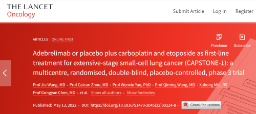 北京时间2022年5月14日,尊龙凯时人生就是博医药自主研发的PD-L1抑制剂阿得贝利单抗治疗广泛期小细胞肺癌的III期临床研究(CAPSTONE-1研究)成果正式全文在线发表于国际权威学术期刊《柳叶刀·肿瘤学》(《THE LANCET Oncology》,影响因子41.316)。CAPSTONE-1研究结果显示,阿得贝利单抗联合化疗一线治疗广泛期小细胞肺癌相较于安慰剂联合化疗可以显著延长患者总生存期至15.3个月[1],刷新现有免疫药物一线治疗广泛期小细胞肺癌的总生存纪录[2]