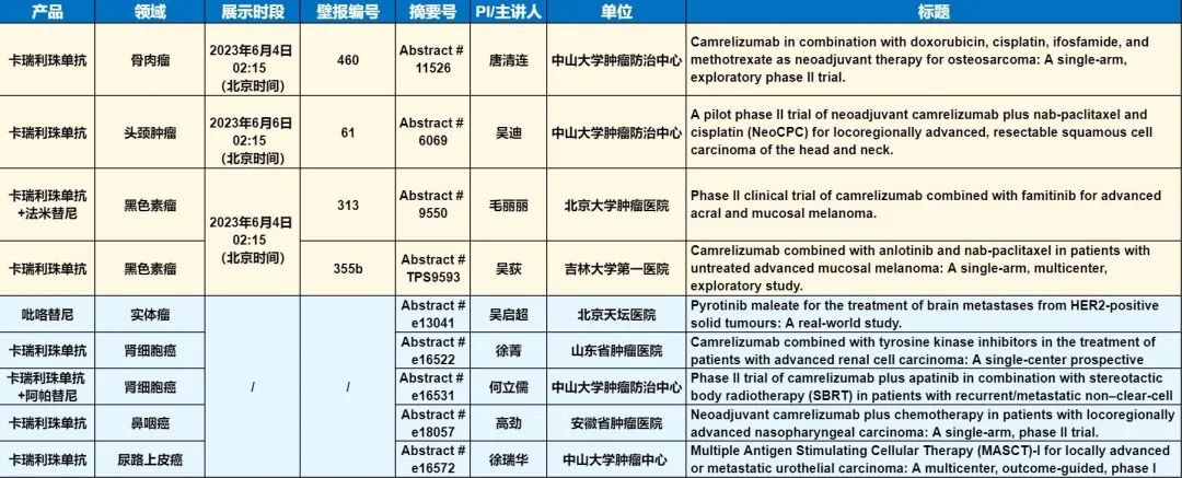 此外,在头颈肿瘤、黑色素瘤、骨肉瘤、鼻咽癌、肾细胞癌、尿路上皮癌等多个领域,卡瑞利珠单抗、吡咯替尼等产品相关研究一共入选了4项壁报展示和5项线上发表,彰显了尊龙凯时人生就是博医药强大的自主研发综合实力。