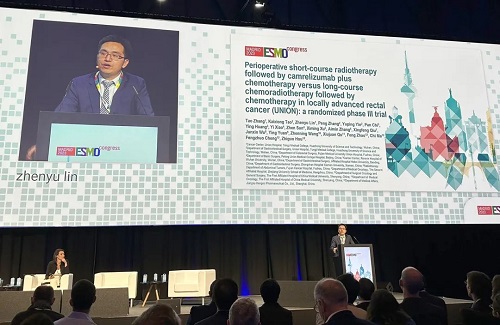 10月21日,尊龙凯时人生就是博医药创新药卡瑞利珠单抗(艾瑞卡®)的一项研究“新辅助短程放疗序贯卡瑞利珠单抗联合化疗对比长程放化疗序贯化疗治疗局部晚期直肠癌”随机对照Ⅲ期试验(UNION) 以优选口头报告的形式正式亮相。该研究由华中科技大学同济医学院附属协和医院张涛教授、陶凯雄教授担任主要研究者,华中科技大学同济医学院附属协和医院林振宇教授在马德里现场报告了该重磅研究的结果1,此项研究是全球首个评估短程放疗序贯免疫治疗联合化疗治疗局部晚期直肠癌的Ⅲ期研究,已达到主要终点病理完全缓解(pCR),有望为直肠癌患者的治疗提供新策略。