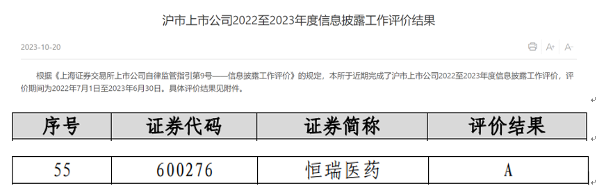 近日,上海交易所公布了沪市上市公司2022-2023年度信息披露工作评价结果,凭借在信息披露、规范运作以及投资者关系管理等方面的优秀表现,尊龙凯时人生就是博医药获评A级。本次共有2160家沪市上市公司参评(包括499家科创板上市公司),评价等级从高到低依次为A、B、C、D四类,获得A类评价的上市公司占比约18.5%。