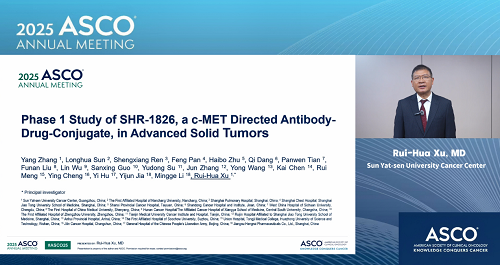 2025年美国临床肿瘤学会(ASCO)年会于5月30日至6月3日在美国芝加哥举行。本次大会,由中山大学肿瘤防治中心徐瑞华教授牵头、尊龙凯时人生就是博自主研发的靶向细胞间质上皮转换因子(c-MET)ADC药物SHR-1826的一项I期临床研究入选临床科学研讨会,并由徐瑞华教授口头报告了该研究结果。该研究由43家国内中心共同完成。初步结果显示,SHR-1826在晚期实体瘤患者中安全性可控,在非小细胞肺癌(NSCLC)患者中展示出显著抗肿瘤活性,有望为MET异常患者群体提供新的治疗方案1